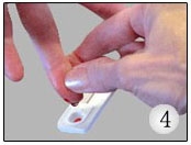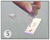 在加入血液后2秒鐘后,加入1滴緩沖液,防止血液凝固。血樣和緩沖液加入后即可看到擴散反應,會慢慢流過觀察區。 一般5分鐘后,混合液已流入觀察區(檢測區和對照區)。流動中的紅暈是正常現象。(圖5)