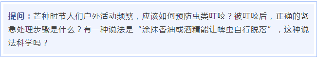 芒種時節戶外活動需要警惕蚊蟲、蜱蟲、恙螨和隱翅蟲等侵襲。蜱蟲吸附皮膚,吸血后體積非常大,往往超過它們身體的5倍以上,它的唾液里往往攜帶多種導致萊姆病、森林腦炎、發熱伴血小板減少綜合征等疾病的病原體;恙螨幼蟲藏在草葉腐土中,人被叮咬后,皮膚上會形成綠豆大小的紅腫水泡,中間可能有焦痂;隱翅蟲體液接觸皮膚會引起條狀潰爛。這些蟲子在氣溫25攝氏度、濕度80%的潮濕環境中最活躍,尤其喜歡棲息在高草區、灌木叢和積水附近。