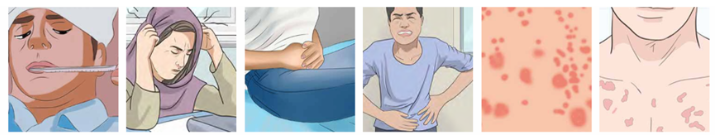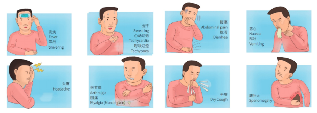 媒介伊蚊叮咬患者或隱性感染者后,通過叮咬傳播給其他人。潛伏期為1~14天,多為4~7天。臨床癥狀表現為發熱(可持續2~7天),劇烈頭痛、肌痛、關節痛、眼眶痛、食欲減退、惡心、嘔吐和皮疹,嚴重時可發展為重癥登革熱,出現出血、休克等危險情況。