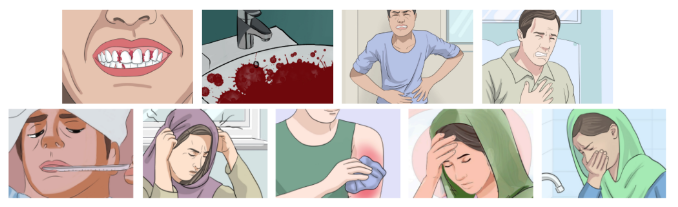 感染登革熱重癥的癥狀包括牙齦出血、嘔血、劇烈腹痛和呼吸急促(上排);輕癥癥狀包括持續高燒、頭痛、肌痛、疲勞和持續嘔吐(下排)