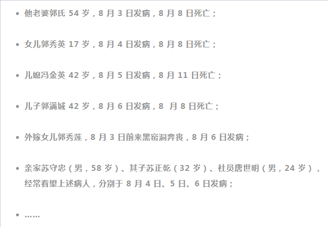 宴別當天,郭的老婆、女兒、兒媳等照顧過他的人,相繼開始發生相同的癥狀。