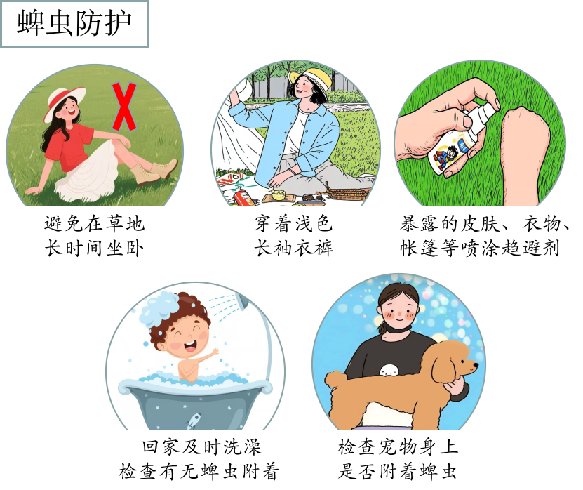 蜱蟲叮咬多發(fā)生于春夏季(4-10月),因南方濕熱的氣候,蜱蟲活躍期相對比北方更長。市民享受美妙的草坪時光的同時,建議采取以下防護(hù)措施: