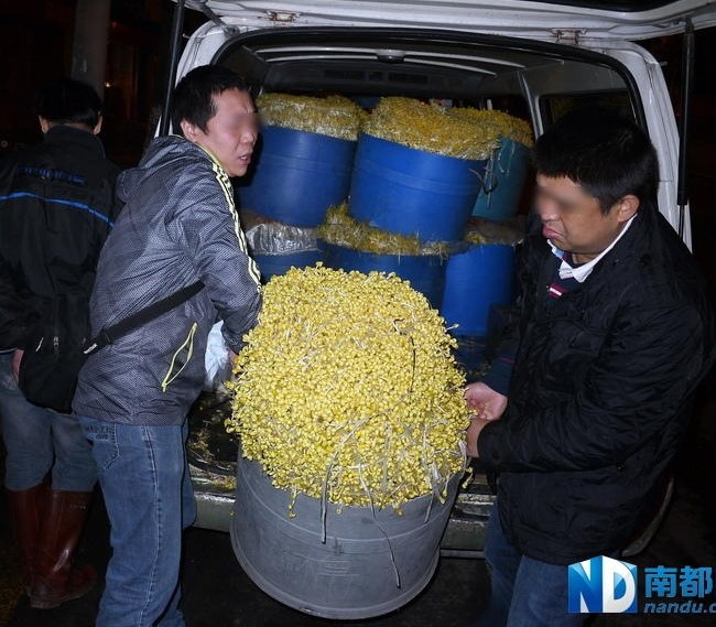 3月5日凌晨5時24分,海珠金溪農(nóng)貿(mào)市場門前,埋伏一夜的干警截獲一輛滿載上千公斤毒豆芽的面包車。南都記者 馬強 攝