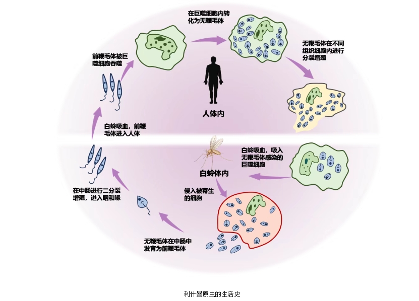 傳播過程?:白蛉通過叮刺病人或受感染的動物宿主時,含無鞭毛體的巨噬細胞被白蛉吸入并在體內發育成具有感染力的前鞭毛體,轉而叮刺健康人,前鞭毛體即隨白蛉唾液進入人體,從而引起感染?。